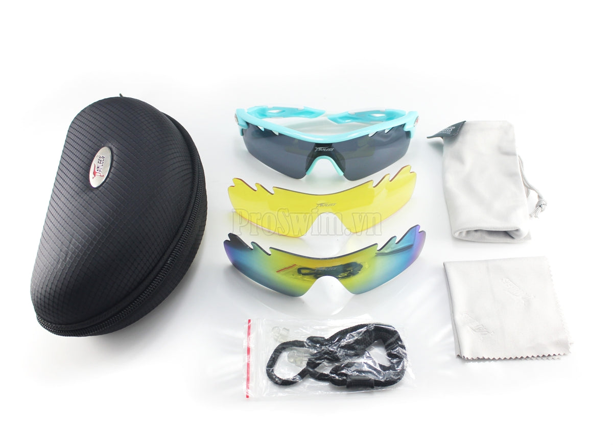 Kính Đạp Xe Chạy Bộ Tennis Panlees PO565 Xanh Lơ - Bộ Kính 3 Mắt Phản Quang Đen Phân Cực Vàng Đi Tối